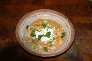This is a nice chili for a complete meal even on a hot summer’s day. The fresh cilantro really makes a refreshing accent.