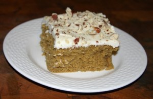 Preheat oven to 350 F. Grease a 15x10x1 pan with shortening or non stick cooking spray. Lightly dust with flour. In the large bowl of a stand mixer combine ingredients of the pumpkin squares and beat on low speed until blended and moistened. Then beat on medium speed for 2 minutes. Turn out the batter into the greased and floured pan.