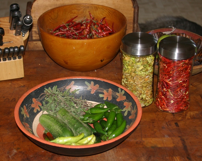 The first photo in this post is today’s harvest. It’s small due to harsh weather we had this summer but you can see the two jars of dried peppers that is the result of many small harvests. Each small harvest can be dried and it will add up to a lot of tasty additions to winter meals. The yellow peppers are sweet banana peppers. That jar equals 5 gallon storage baggies of fresh peppers. The dried red peppers are a mix of cayennes, red serranos and red jalapenos and it equals 8 gallon baggies of fresh peppers. These red peppers will be ground to a fine powder to use on the table and it will be an ingredient into our “Fuzz’s No Salt Cajun Blend”.
