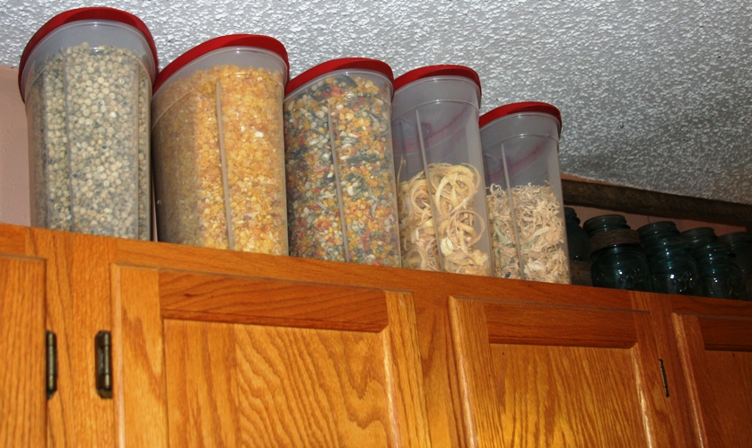 are on top of my kitchen cabinets and are within easy reach when I am making a soup or a stew. The peas, corn and mixed veggies were one pound frozen bags that I bought when they were on sale at the local grocery store. Each of those three containers hold 8 bags of frozen veggies. The onion container holds 10 pounds of fresh onion slices and I haven’t finished filling that one or the cabbage container. I shop for sales and try to buy cheap.