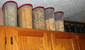The second photo shows five Rubbermaid “Cereal Keepers” storage containers that I bought at Wal-Mart. They contain peas, corn, mixed veggies, onions, and cabbage. These