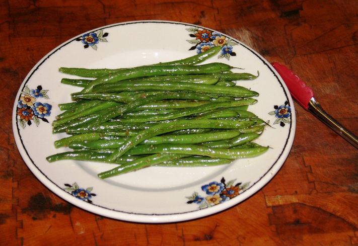 Tonight we had this side dish with grilled chicken thighs. Steaming the beans first makes the beans tender, then the sauteing makes them a little crispy.