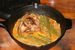 My husband ranked our dinner tonight as the best lamb he has ever had. And he has lamb overseas in very hot countries that specialize in lamb and goat, so I am a happy lady! I used one 2 1/2 pound lamb shank, bone-in for the two of us and it was enough for our dinner tonight and lunch tomorrow. Be sure to trim the fat off before browning, it will cut down on the grease in the skillet. Cast iron is an excellent choice for this dish because the iron will even out the heat from the stove top burner.