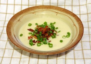 Cook the slices of bacon until very crisp. Ladle soup into bowls and top with bacon crumbles and green tops of the onions. Serve with crusty French bread.