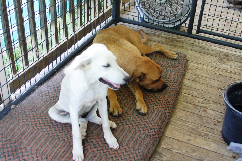 These two sweet girls had been walking up and down the dirt road for about a week. When we went to town today, they were at the entrance to my driveway. I could see their ribs and I could not just drive away. I lured them with food into my yard and into the kennel on the front porch. They were so hungry. I gave them a little food and they kept it down. They are flat out sleeping now because they have a safe place to rest. Well, I have named them and so I’m keeping them. Gwen is the white female puppy. Morgann (La Fay) is the tan one. She looks like a mix of boxer or mastiff. Both have such sweet personalities. I just cannot understand people who would ditch a dog. I understand that the economy is hard for alot of folks but there is no reason for doing this.