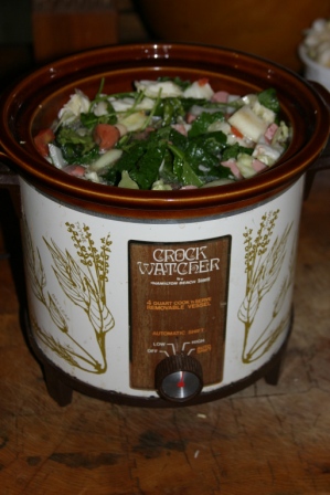 In a 6 quart Crock Pot, combine everything except the spinach/kale. Cover and cook on low for 7 to 8 hours. About 30 minutes before serving add in the spinach/kale. Serve with a crusty country style bread.