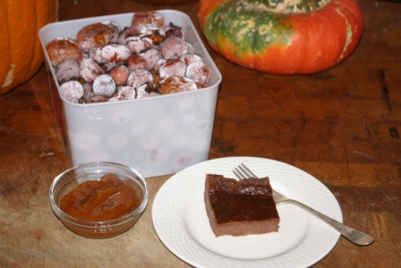 It is best to process the persimmon for pulp before you intend to use it. It does take a little while to separate the flesh/pulp from the seeds. There are at least 5 seeds in each fruit. Old wise women say that you can determine what kind of weather the winter will have in store. You can cut a seed open and look at the shape made when it splits. A knife will foretell a cold cutting winter. A fork tells the tale of fluffy snow. And a spoon will tell you to buy a shovel for all of the wet snow that will come. I have not tried this yet this year.