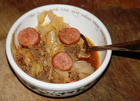 In a large heavy bottom soup pot, brown the ground meat for about 5 minutes or until no longer pink. Remove from pot and drain the grease. In the same pot and over medium heat add butter and allow to melt. Add sliced cabbage and a pinch of salt. Sauté cabbage until tender about 10-13 minutes. Add in the browned ground meat and sliced sausage. Heat and stir for about 5 minutes. Add the remaining ingredients. Season to taste with salt and pepper. Adjust the taste with more Worcestershire Sauce and vinegar. This should be a slightly sour soup. Bring to a boil and reduce to simmer. Simmer for 30 minutes. Enjoy with a dark brown or Russian Black bread or even a sourdough.