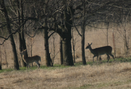 Well, they really aren’t mine. They just visit every day. They were absent for a long time while I leased my pastures to my neighbor who ran some mama and baby cows on them. Funny how the deer do not like cattle. It doesn’t make a difference to the cows though. These two does are on the fenceline between two of my pastures.