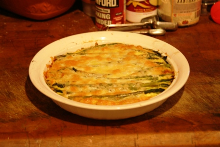 Pre-heat oven to 375 degrees F. Grease a 9 inch pie dish. Set aside about ¼ cup of beaten egg. In a large bowl, combine the rest of eggs with 2 cups of mozzarella cheese and garlic. Stir in spinach. Pour into pie dish. Layer the asparagus on top of egg mixture. Pour reserved egg on top of asparagus. Sprinkle the ½ cup of grated cheese and the parmesan cheese on top. Bake for about 30 or until the edges are brown.