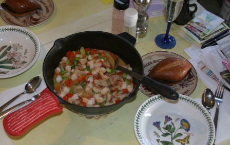 his week I was watching OETA Create. It’s the PBS station in Oklahoma. Anyway, Nick Stellino’s cooking show featured a shrimp, pepper and asparagus ragu. Now it so happens that asparagus is popping up in my garden. Oh so good. After I came home from my errands today, my planned dinner was this shrimp ragu. And it was yummy! I had some day old bread and I made garlic bread. Up ‘til that point it was fairly lo-carb, but there are times when you just have to go for it! I hope you enjoy this as much as I did.