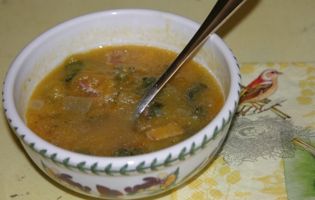Fall is here is Oklahoma and I am loving it. The weather is cooler and a little rainy. Perfect time for Autumn soups. This recipe is not low carb as are some of my recent ones. Sometime you just have to say, what the heck and go for some great soup. I found this recipe on Martha Stewart’s site. I always change things up for my taste. I roasted my acorn squash fresh versus using frozen. It took longer, but the sweet roasted flavor was there! I also added more bacon because….. well because I love bacon. LOL. I used fresh garden kale, (yup mine is growing) with blanched kale from the freezer. This weekend was cook from the fridge and freezer. Recently I ordered a half side of beef from my local butcher. They raise their own. It will be ready in mid-December, and now I must get another deep freezer. I planned this for years and finally everything fell into place for me. Well, enjoy this recipe!