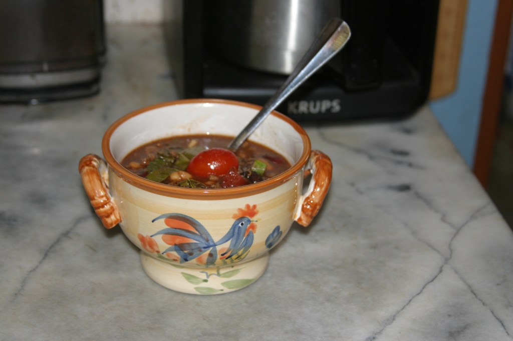 Now this recipe is not a gourmet meal, it is ,however very feeling on a cool Autumn day. The beans are canned and the ground beef is browned in a skillet so it only needs about 3 hours on high to be ready for lunch. I have always been a frugal shopper. I can sniff the quick sale items as soon as I enter the store.  LOL.  I recently retired and I really need that skill I honed while I was at my town job. And the price for food has skyrocketed!  The kale is from my garden that is still producing a lot of food. Even though we had the first frost. I have the kale pots under the eave of my porch. The ground beef was a quick sale score (reduced 50%) that was in my deep freezer. I don’t buy ground meat at the store. I try to buy quick sale cuts and grind it into hamburger with my KitchenAid mixer and the grinder attachment. The pint of grape tomatoes was a 29 cent buy a couple of days ago.  This recipe makes a huge amount of stew, 8 to 10 quarts. This stew does freeze very well, so you can portion into servings and have stew in the freezer for a cold Winter’s day.