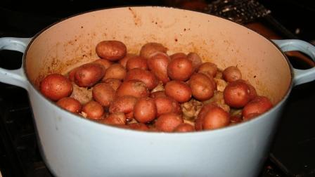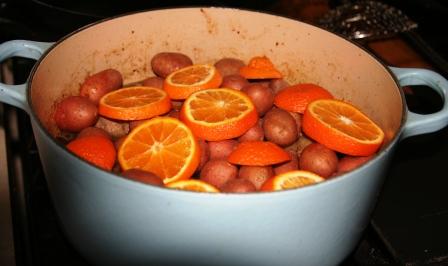 Add pork and onion mixture to the dutch oven. Cover the mixture with a layer of tiny potatoes. Season to taste. Top the potatoes with the sliced oranges.