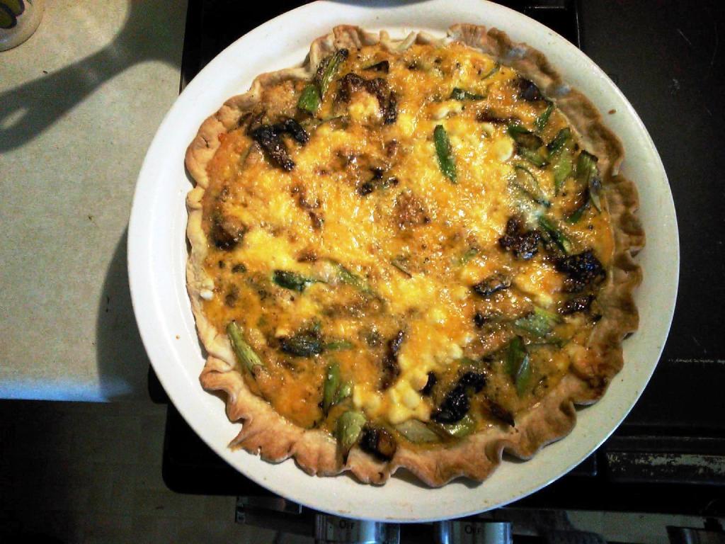 Pre-heat oven to 375 degrees F. Place the pie shell in a deep dish 9” pie dish. Set aside. Cook sliced bacon in a heavy bottom skillet for 3 minutes. Add mushrooms and asparagus. Cook until the bacon is browned and crumbly. Salt and pepper to taste, but remember if you are using Chevere cheese it is salty. As is the bacon. Spoon the mushroom mixture into the pie shell. In a medium mixing bowl beat the eggs. Add the Chevre cheese to the beaten eggs. Pour the egg and cheese mixture into the pie shell. Top with grated cheese. Bake for 35 minutes. Allow to cool for 10 minutes before serving.