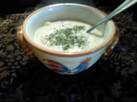 This soup came about, as usual, from my quick sale produce. I bought two 10 pound bags of russet potatoes for $1.00 each and a head of cauliflower for $2.00. The cauliflower was a bit more expensive than usual but I bought it anyway. I cooked and mashed the cauliflower as a side for some mini meatloaves several days ago. I used the leftover mash in the soup. I had a gallon bag of chicken bones and skin in my freezer that I would simmer to make a chicken stock as the soup base. Yesterday was a little cool. A perfect day for a big pot of soup.