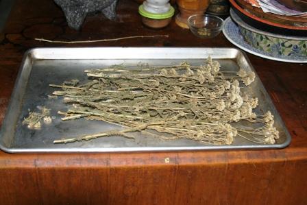 Every year I gather yarrow to hang and dry in my pantry and living room. When I’m ready to process the dried flowers and foliage, I strip them from the thicker stalks. Then I chop/grind the flowers and leaves in a food processor. I don’t use a blender for this step because I can control the fineness of the grind with the food processor. The chopped and cut flower/ leaf mixture is good to make teas and tinctures while a finer ground powder can be used for a poultice for wounds or bruises. A freshly masticated flower/leaf mixture can also be used effectively as a poultice if you don’t have the dried herb mixture. I use the stalks as kindling for starting fires in my fire pit.
