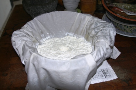 After two hours line a colander with muslin or cheesecloth. Carefully ladle the mixture into the colander. Let the cheese drain for one or two hours depending how dry you want the cheese to be.