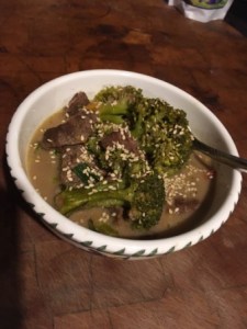Put beef, stock, tamari, sweetener, sesame oil, sriracha sauce and garlic in the slow cooker. Cook on high for four hours. Add the broccoli and cook on high for 30 minutes, until the broccoli is tender. Season to taste. Serve with green onions and sesame seeds. Can serve with cauliflower rice as a side.